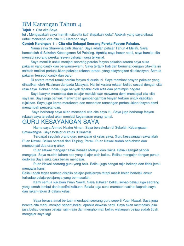 Pada mulanya saya enggan mengikut mereka sebab ada banyak kerja sekolah yang perlu diselesaikan. Contoh Karangan Cuti Sekolah Tahun 4 Koleksi Contoh Karangan Dan Latihan Bahasa Melayu Cikgu Mohd Fadli Salleh Online.